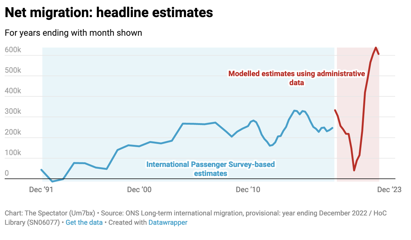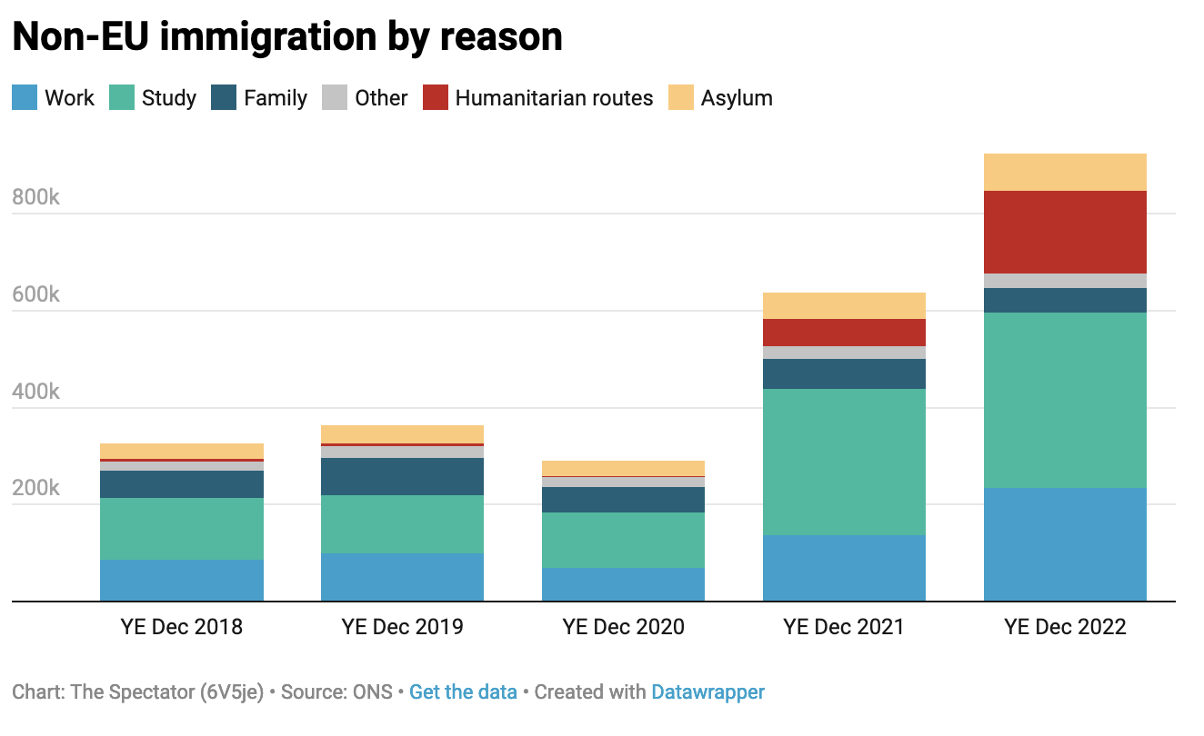Home Secretary Suella Braverman has been on a rampage against higher levels of net migration taking place under her watch, calling for net migration to fall to ‘tens of thousands’ — reminiscent of Theresa May’s goals back in the 2010s. Rishi Sunak has tried not to get too specific about his thoughts on legal migration policy (he is thought to have vetoed Braverman’s plan to raise the minimum salary threshold for skilled workers to come to the UK), but has put on record that the headline figure is too high. Such views are not confined to the Tory party. Keir Starmer went hard at PMQs yesterday lamenting the ‘quarter of a million work visas issued last year’, accusing the prime minister of having ‘lost control of immigration.’