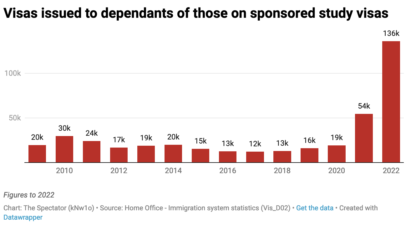 The estimates originally came from a Centre for Policy Studies report, which calculated (based on visa approval statistics) a series of net migration scenarios. The assumption was that student visas were skyrocketing, as were the number of dependents they were bringing in: a ‘back door’ route to the UK labour market, as it was described by Home Secretary Suella Braverman.