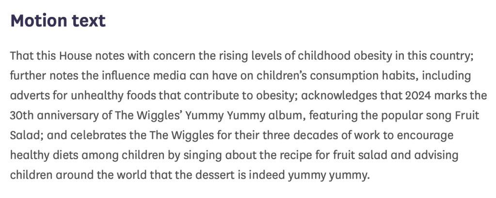 But is Wilkinson living up to his constituents’ expectations? Possibly – if they happen to find themselves particularly concerned with, um, the Wiggles. In a rather bizarre move, it transpires that the new MP has tabled an early day motion about the Australian children’s music group – on the very important matter of their ‘Yummy Yummy’ album’s 30th anniversary. Just when you thought Sir Ed Davey’s Lib Dems couldn’t get any weirder…