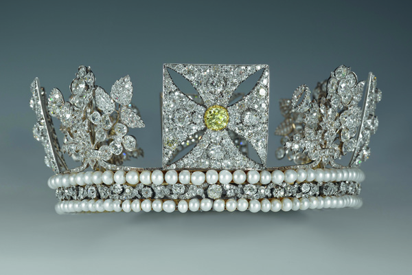 These stunning pieces were acquired by six monarchs over three centuries. Many of the stones have been recut or made into new settings, such as the Fringe Brooch, belonging to Queen Victoria. The larger stones in this brooch are believed to have come from one of the two jewels given to her by the Sultan of Turkey. She wrote in her journal of 8 May 1856 that she decided she could not wear one of the jewels and wished to have it reset. The result: a huge emerald-cut central stone, with smaller ones set around it from which nine strands of diamonds hang — a shimmering delight.