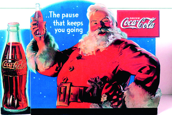 The evolution from Saint Nicholas, sourced in the 4th-century Christian Greek Bishop of Myra, patron saint of children, to the secular, rubicund, guffawing, unwholesome, gift-distributing, grotto-dwelling Santa was fixed in the popular imagination with advertisment artwork for the Coca-Cola Company of Atlanta by a depressive Swedish painter called Haddan Sundblom. Santa belongs not to the ages, but to a US beverage corporation.