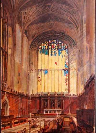 Detmar Blow’s painting in oils of the chapel with the reredos in place is over seven feet in height and more than four feet wide. It was done to show the college what his design would look like in situ and was presented to the college by my grandmother. The college returned the painting to me when the Blow design had been removed. The painting is majestic. ‘Edwardian mannerist’ is how Michael Jaffé described the style to me. Now the chapel’s east end stands naked of all panelling — blank stone walls stare at you — and few now look up at the stained glass of the east window. The Rubens dominates, and brings with it a severe clash of styles, as Sir Nicholas Pevsner noted.