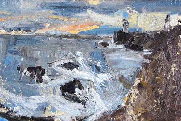 The tough Joan chose the challenging subject matter, dividing her time between the rotting tenements of unreconstructed Glasgow and the leaky fisherman’s cottages of Catterline, south of Aberdeen. Her restless eye was irresistibly drawn to moving targets, whether swarms of street urchins in clashing hand-me-down clothes or crashing breakers under granite skies, see ‘Todhead Point’ above (during one blizzard her easel had to be secured with an anchor).