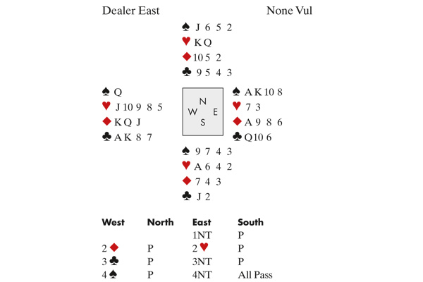 Welland’s 2♦ was a transfer, and 4♠ a singleton slam try; Auken signed off in 4NT. South led a diamond. Auken cashed three rounds, unblocked the ♠Q, came to hand with the ♣Q and cashed the last diamond. North knew a heart or club discard would give declarer an extra trick, so she threw a spade. Mistake: three round of spades later, North had to discard on declarer’s ♠10. Dummy still had three clubs and was down to a singleton heart. North opted to discard the ♥K. Now Auken cashed the ace and ten of clubs and exited with a low heart. South, knowing that North, if she won, would have to concede a trick to dummy’s ♣K, executed a crocodile coup by rising with the ace. And now Sabine made 12 tricks when South had to concede the ♥6 to her master ♥7!