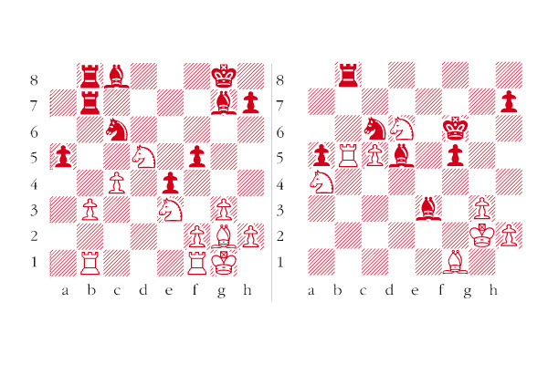 1 e4 c5 2 Nf3 Nc6 3 d4 cxd4 4 Nxd4 Nf6 5 Nc3 e5 The key move of the Sveshnikov Variation. Black weakens the d5-square but gains time by hunting White’s king’s knight around the board. 6 Ndb5 d6 7 Bg5 a6 8 Na3 b5 9 Bxf6 gxf6 10 Nd5 f5 11 c4 This is extremely unusual and was met by 11 … Qa5+ in the game Volokitin-Eljanov, Ukraine 2012. 11 … b4 12 Nc2 fxe4 13 g3 13 Ndxb4 has been seen before but this is a new departure. 13 … Bg7 14 Bg2 0-0 15 Bxe4 Rb8 16 b3 f5 17 Bg2 e4 18 Rb1 Qa5 19 0-0 Qxa2 20 Nde3 Qa5 21 Qxd6 Rf6 22 Qf4 Qe5 23 Qxe5 Nxe5 24 Nd5 Rf7 25 Ncxb4 a5 26 Nc2 Rfb7 27 Nce3 Nc6 (see diagram 1) 28 c5 White’s danger in this position is that Black’s bishop pair may free themselves and cause havoc. For this reason the immediate 28 f3, or even g4, liberating White’s last remaining bishop, is better than the move chosen. 28 … Rxb3 29 Nb6 White is over-pressing. The simple 29 Rxb3 Rxb3 30 Bh3 leaves a position with chances for both sides. 29 … Rxb1 30 Rxb1 Be6 31 Bf1 Bd4 32 Rb5 Kf7 33 Nec4 Kg7 Black avoids the trap 33 … a4 34 Nxa4 Rxb5 35 Nd6+. 34 Nd6 Kf6 35 Na4 e3 36 fxe3 Bxe3+ 37 Kg2 Bd5+ (see diagram 2) The worst has happened. The two bishops have leapt out and now contrive to force the white king to the edge of the board where it is subject to continual mating threats. 38 Kh3 Rxb5 39 Bxb5 Ne5 40 Nc3 Bf3 The threat is … Ng4, ensnaring the white king. 41 Be2 Bxe2 42 Nd5+ Kg5 43 Nxe3 Ng4 44 Kg2 Nxe3+ 45 Kf2 Nc4 White resigns 46 Kxe2 Nxd6 47 cxd6 Kf6 wins easily.