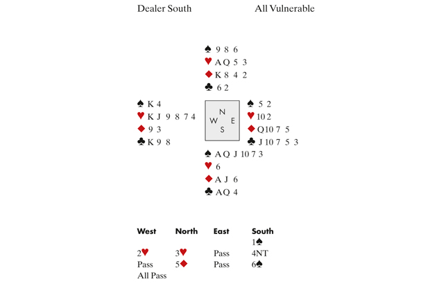 Realising that West should hold most of the missing honours for his vulnerable overcall, Artur cashed the ♠A at trick two. He followed with a heart to the Queen, played the Ace of hearts discarding a club and ruffed a heart in hand. A small diamond to dummy was followed by another heart ruff. The stage was set, and West must have known what was coming — he was thrown in with the ♠K and had to concede the rest.