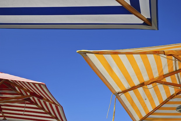 What does one do with a picture postcard that speaks to the imagination as subtly as this? I mounted it. The mount I then put in an ash frame, which I hung above the lavatory exactly at eye level. For a year, each time I stood at the bowl, my mind’s eye contemplated those deserted tables beneath those festive umbrellas. The invitation was patiently insistent. The empty tables and umbrellas, the shops, the fountain, the trees: they were waiting, promising, daring.