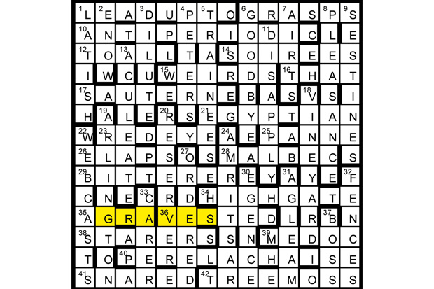 The part quotation was ‘BUT WESTWARD, LOOK, THE LAND’ (1/5/28) from Say not the struggle naught availeth by Arthur Hugh Clough. Remaining unclued lights, read from right to left (‘westward’), each contain a ‘land’: Libya (4), Oman (23), Iran (30), Cuba (35) and Italy (41). CLOUGH (in the fourth column) was to be shaded.