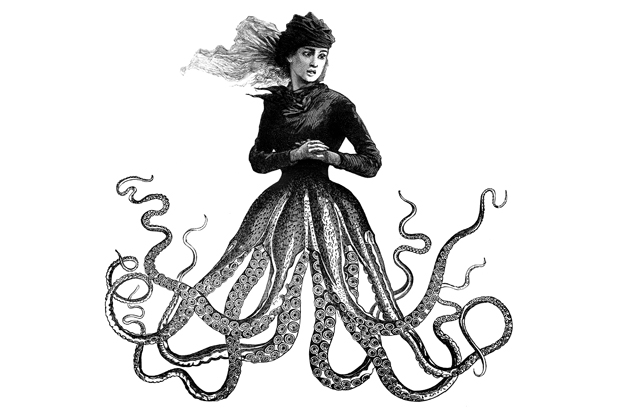 Many of them pick up on the era’s sinister undertones. The blurb for Dan Hillier’s engraving ‘Mother’ (a woman with octopus tentacles instead of legs, above) talks of ‘prim order barely concealing a dark underbelly of animalistic impulse’. There’s also a wedding cake made from human hair and a wing-back chair adorned with stuffed ferrets. A magic lantern using strobe lighting to make fake moths ‘come alive’ is stunningly spooky.