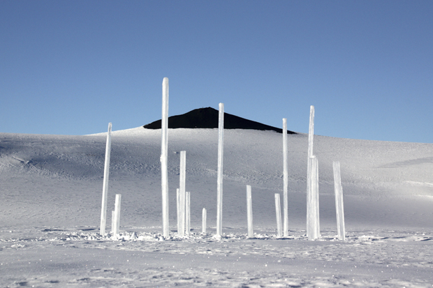 Travelling to Antarctica with a party from New Zealand’s University of Canterbury, Julian was able to test the feasibility of his idea: 33 large ice pipes, one for each member of the shore party, including five black ones (dyed with squid ink) for those who lost their lives. The three-metre-high pipes were constructed from PVC moulds, each consisting of an inner 50mm and an outer 100mm tube. The space between was filled with water and since the outside temperature of –3ºC was too high for a quick freeze, the freezer at Scott Base was pressed into service.