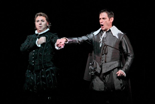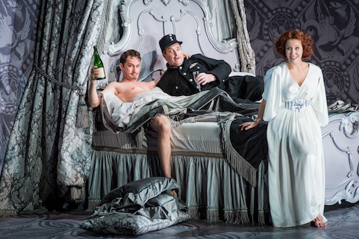 So not much fun, though the translation, by Daniel Dooner and Stephen Lawless, is lively and witty; but I wish they’d checked it with someone literate, so they could have avoided the numbing solecisms of the chorus’s singing ‘What a great pleasure for we’ and later ‘I said to she’. The cast were mainly poor at projecting spoken dialogue, of which there is a fair amount, so that it was only the sung parts that were easily intelligible, thanks to surtitles.