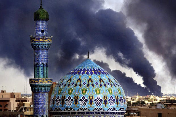 Meanwhile, IWM London’s photography shows (Mike Moore and Lee Craker, and Donovan Wylie (until 5 January) are conventional, but no worse for it. Craker’s simple black-and-white snaps of US servicemen edge towards sentimentality; but the proud officers unfurling the Stars and Stripes are real, which saves them from being caricatures. Moore’s subjects are Iraqi nobodies and buildings, memorable for his understanding of colour and light (‘Baghdad, Iraq’, March 2003, above). Wylie has spent much of his career photographing military outposts in Northern Ireland, Afghanistan and the Arctic. These structures are supposed to project power; but Wylie exposes their vulnerability, with menace louring in every part of the frame. Soldiering looks a nervous, lonely business