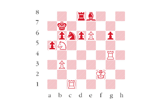 Black to play. This is a variation from Anand-Carlsen; World Championship (Game 4), Chennai 2013. Anand avoided this position, although he is material ahead. What had he foreseen? Answers to me at The Spectator by Tuesday 26 November or via email to victoria@spectator.co.uk or by fax on 020 7681 3773. The winner will be the first correct answer out of a hat, and each week I shall be offering a prize of £20. Please include a postal address and allow six weeks for prize delivery.