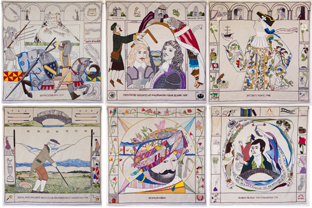Of course there is something else happening in Scotland on 18 September 2014 that is giving more than the Scots cause to look at both their past and their future, but perhaps the date for that was not fixed when the tapestry was conceived. He then recruited the writer Alistair Moffat to select the subjects and write the text, the artist Andrew Crummy to draw up the designs and Dorie Wilkie to ‘supervise and inspire’ the stitching. Hers must have been a Herculean task and one it would be interesting to know more about. Almost all the panels are the work of groups — in one case of 33 people — and many are worked in different places, so the logistics cannot have been simple.