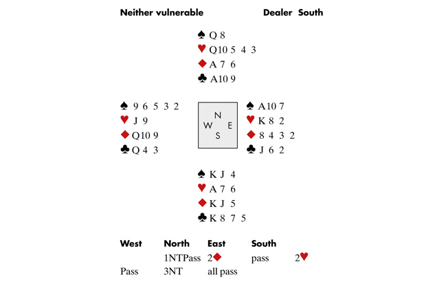 At this point, one of the commentators predicted that South would cash the ♥A and then play low towards dummy, hoping that an honour would appear on his left, and if not, he would have to make a good guess whether to put up the ♥10 or ♥Q. Zia, however, crossed to dummy’s ♣A at trick 3, and played a low heart. Look at the pressure East was under: suppose South held ♥Jxx — West would take the ♥J with his ♥A, and if he continued spades, East would have none to return when he got in with his ♥K. And so East hopped up with his ♥K to preserve his partner’s ‘late entry’ — enabling Zia to make all the hearts and 11 tricks.