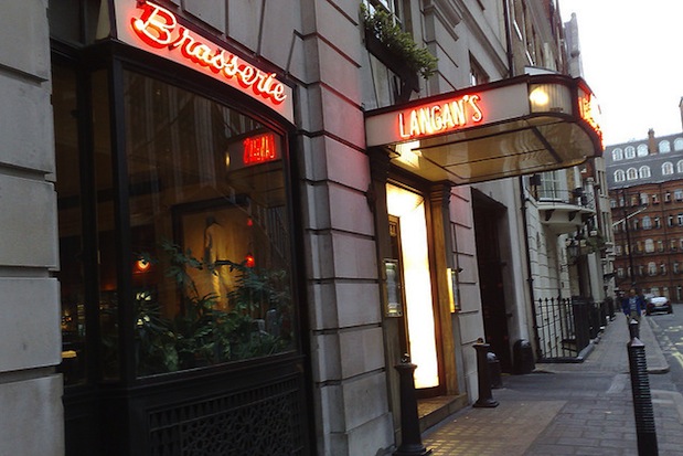 Langan’s Brasserie announces its presence with a long, pink neon line of Langanses, tootling prettily along its façade, which is opposite Marks & Spencer on Green Park. (The apostrophes, by the way, are mine; signage can be illiterate.) So this is a restaurant with Alzheimer’s, a restaurant that has forgotten its own name.