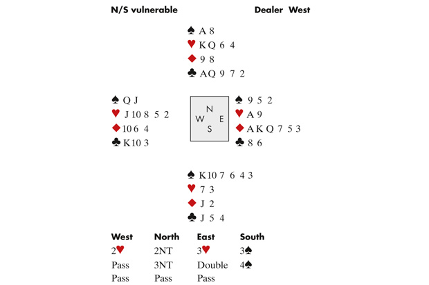 It was, admittedly, an eccentric auction. West opened a weak 2♥, I overcalled 2NT, East decided to raise instead of mentioning his diamonds and then, when I bid 3NT, decided to help us reach a better spot by doubling! West led the ♥J. Mini played dummy’s ♥Q and East won with the ♥A. He then cashed two diamonds before switching back to hearts.