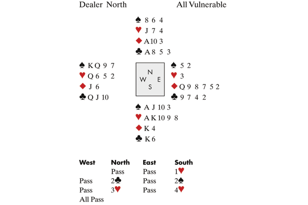 The pairs in 3NT had no trouble, but there was a string of results showing 4♥ down one. What happened?