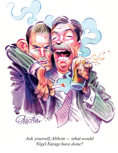 So how should Abbott have responded? Certainly not in the awkward way he did with a halting, typical bloody politician’s reply and a self-conscious, theatrical wink which made him look like the heartless, two-faced, cynical bastard I’m quite sure he isn’t. Instead he should have first paused a while and silently asked himself a simple question: ‘What would Nigel Farage do?’