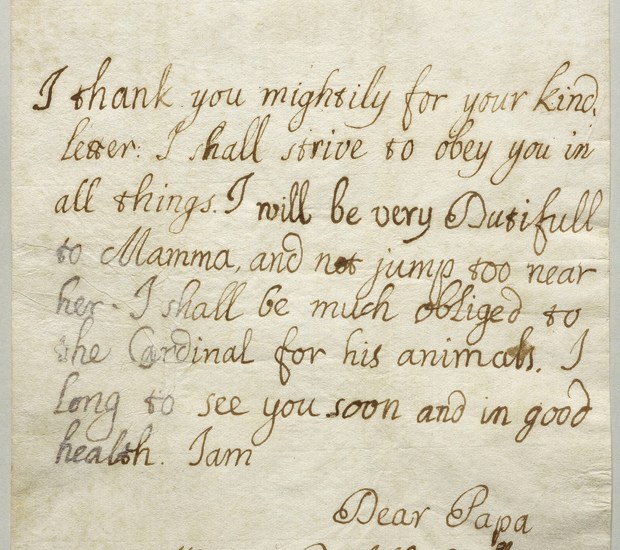Private documents from more distant monarchs are housed in the archive, although these tend to be rarer. A charming letter from a seven-year-old Bonnie Prince Charlie (above) reassures his father that he is behaving himself during exile in Rome.