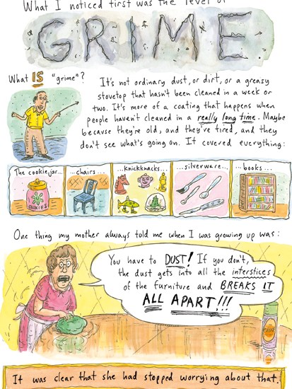Almost nothing is sacred here. Dignity? Forget it! There’s the dust and grime and accumulation of the parents’ apartment, their pathetic fears and stubborn refusal to face the reality of being infirm and slightly gaga; in time there are incontinence pads, bedsores, gaping mouths. The only thing Roz Chast hasn’t done is draw her parents’ bottoms. And she doesn’t even pretend not to mind the enormous financial cost of their long-term residential care and nursing.