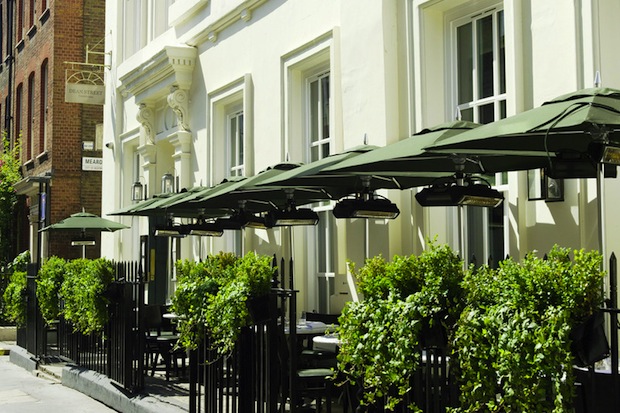 It is a Victorian cream cake, five storeys high and smooth, with rackety warehouse windows on top. There are tables outside with racing-green umbrellas, should your lungs be able to cope with the fug of the London bowl, which finds its nadir in Soho. (Oxford Street, to the north, has the worst air pollution in the world. I read that in the newspaper of everyday terror, the Daily Mail.) Otherwise, Soho is polished, home to luxe sex shops, branches of Costa Coffee and the sort of angsting people in fashionable spectacles that Martin Amis writes about. But the fug — and the native Soho smell of bleach and animal fat — remains. It is ineradicable, a place for coughing and retching and what psychopaths call ‘networking’. (Non-psychopaths call it ‘making friends’). Sometimes I count the trees in Soho, and sympathise. They look sick.