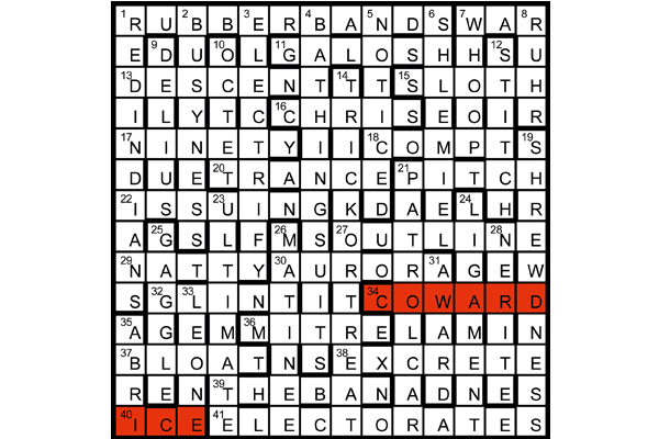 The unclued lights are ‘nouns of assemblage’, all listed on page 6 of the Word Lover’s Miscellany section in Chambers 2011. Solvers had to shade to highlight COWARDICE (34A + 40A).
