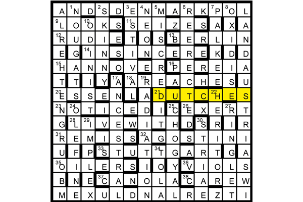 The grid represents Germany, with six bordering countries round the edge, and four cities in the interior, positioned roughly appropriately in relation to each other. 21 across is an anagram of DEUTSCH, which could be added to LAND to make DEUTSCHLAND.