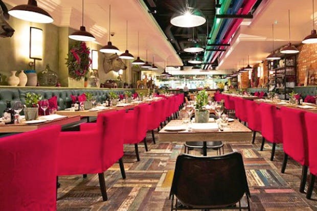 Down we go into what I can only call a restaurant styled on the principles of loveless sex for diamonds; a pre-shag-and-swift-abandonment restaurant, quiet in early September, because the ordinary clientele are on their yachts playing Angry Birds and cheating on their wives with their best friends, and all the other evil but also quite naff stuff that plutocrats do, at least according to The Colbys, which is my reference material in these matters. It is long and low, and lit with Terence-Conran’s-brain-style overhead lamps, with long green banquettes, raspberry chairs and tiny tables of the sort that the tiny — the billionaire children! — can squeeze past en route to the next deal. There is exposed brickwork, as if the plasterer died en route from somewhere else, a wine list for competitive ordering of claret, and what I think are bison heads, staring with thwarted malice from the exposed brickwork; ah, the bad apes! We created a civilisation and hung bison on the wall and ate spaghetti. And for our next trick?