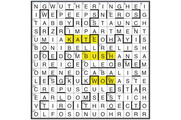 Songs by KATE BUSH include WUTHERING HEIGHTS, HAMMER HORROR, HOUNDS OF LOVE and CLOUDBUSTING in the perimeter, and (defined by the puzzle’s title) WOW.