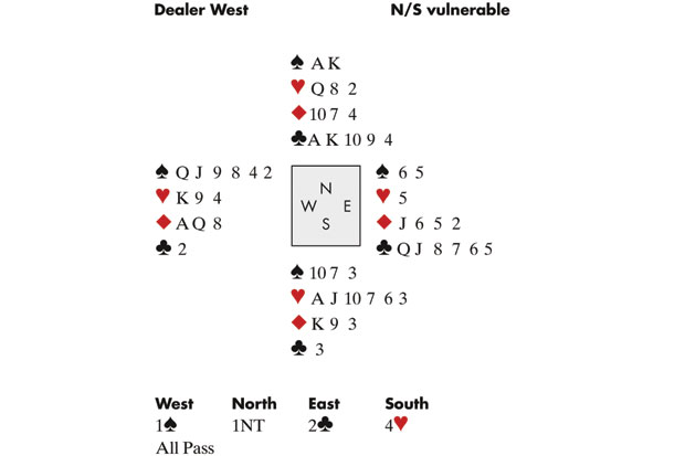 West led the ♣2. Ten tricks are tantalisingly close but the problem is that you can’t enjoy the King of Clubs unless you draw trumps, and if you draw trumps — you can’t get a Spade ruff in dummy.