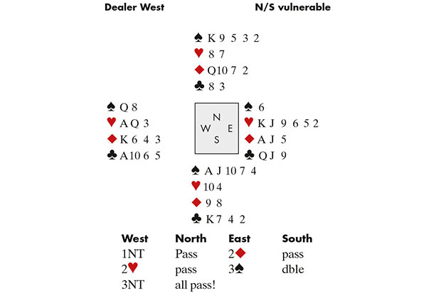 West took the Jack but found himself pseudo endplayed: having not followed the small cards in the minors carefully enough, he couldn’t work out which minor to exit, and, loath to give a ruff and sluff, he played a heart. Game over!