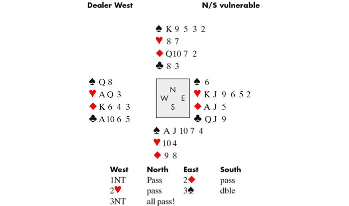 Two diamonds was a transfer and three spades was a splinter. Berkowitz’s 3NT was meant to be forcing (many experts play that once a major-suit is agreed, 3NT shows slam interest). Cohen thought it was natural and passed. It gets better. Another of the world’s best pairs was defending: Jeff Meckstroth (North) led the ♠2 and his partner Eric Rodwell played the ♠10! Having also believed 3NT was natural, Rodwell had placed his partner with Qxx…Thank God it doesn’t only happen to us mere mortals.