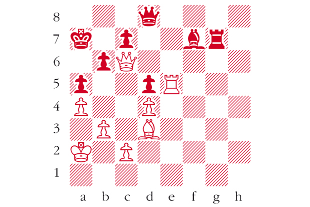 White to play. This position is from Caruana–Ponomariov, Dortmund 2014. The structure is symmetrical but White’s pieces are very active. How did Caruana make the most of this with a stunning combination? Answers to me at The Spectator by Tuesday 6 January or via email to victoria@spectator.co.uk or by fax on 020 7681 3773. The winner will be the first correct answer out of a hat, and each week I am offering a prize of £20. Please include a postal address and allow six weeks for prize delivery.
