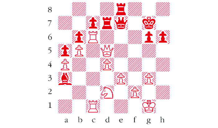 White to play. This is a variation from Carlsen-Aronian, Wijk aan Zee 2015. Black has just played his bishop to a3, uncovering an attack on the white queen while also threatening the c1-rook. How can White respond to this double attack? Answers to me at The Spectator by Tuesday 3 February or via email to victoria@spectator.co.uk or by fax on 020 7681 3773. The winner will be the first correct answer out of a hat, and each week I am offering a prize of £20. Please include a postal address and allow six weeks for prize delivery.