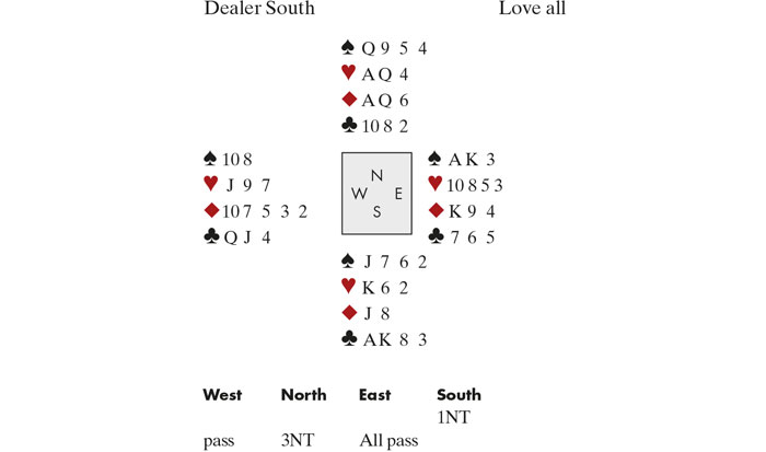 Isaac did very well to raise directly to 3NT with his flat 14 count. If he had gone through Stayman (which most other pairs did) they would have ended up in 4♠ which has no chance. West led ♣Q and Jasmine counted 6 top tricks. She knew she could make an extra trick in clubs so she won the ♣K and played ♣3 towards dummy. West grabbed his Jack and switched to a low diamond. Needing two more tricks Jasmine played low from dummy and East won his King and continued diamonds. Although the finesse had lost, she now had an extra diamond winner. Only one more trick to find — and that had to come from the spade suit. In dummy with the diamond, Jasmine played ♠4 towards her hand. East took his Ace but now declarer could force a spade winner for her ninth trick.