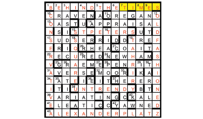 Unclued lights were set out in the form of two squares in the grid (shown here in red). The theme word was 18. 1, 10, 12 and 38 are defined by it in one sense; 15, 19 and 43 in another. Highlighting TIMES (square) gave the fourth example of a city square.