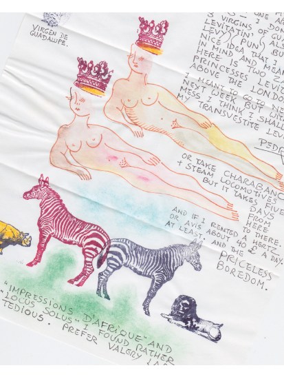 We have been exchanging letters ever since, and the correspondence has grown into something extraordinary. Mine to Pedro are conventional enough, usually on pale blue onion-skin writing paper, sent in air-mail envelopes. But his to me are magnificent creations. The envelopes alone have given many a postman a peyote turn, decorated in coloured inks, stickers and stamps, all the more striking for being done in a highly considered, orderly manner. The letters themselves are usually large single sheets in which the writing winds in and out of some bizarre surrealistic creation in vivid colours. Somehow they could only be Mexican.