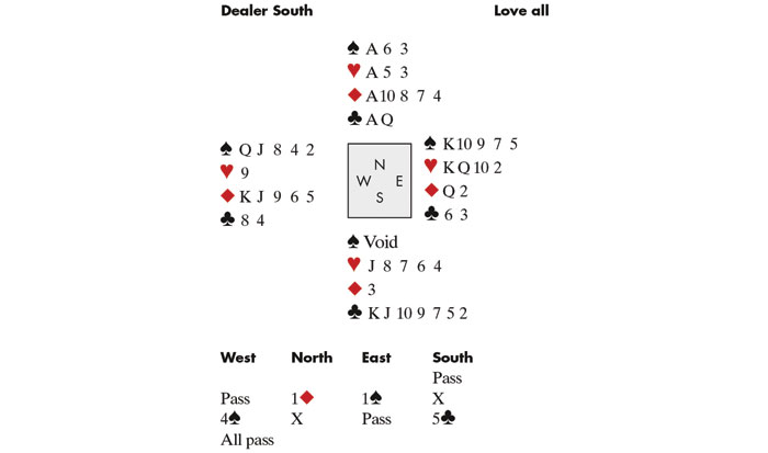 South clearly had huge distribution: 7–4 or 6–5 seemed to be the minimum, and probably the King of Clubs was his only high card. So, how were they going to beat this? The only chance was to take three tricks in Hearts. Having worked this out, Graham produced the only card to give the defence a chance — the Ten of Hearts! When south played the Jack, Frances ruffed and returned her last trump. Graham could win the next Heart and return his remaining trump, and South had to lose one more Heart trick to the King.