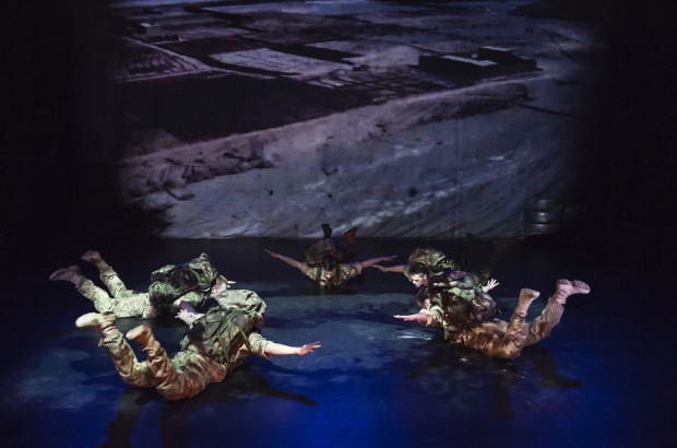 But high tension, apprehensiveness, emotional denial — what’s really in the fighter’s head — these are physically antipathetic to dance’s expansive language. This is why Rosie Kay’s 5 Soldiers: The Body is the Frontline is so powerfully striking and bold a dance work. If you were told that these were actually five British soldiers reliving daily experiences, you would at first believe it, so brutishly physical is their long opening sequence of quick marches and repetitious exercises through imagined enemy territory.