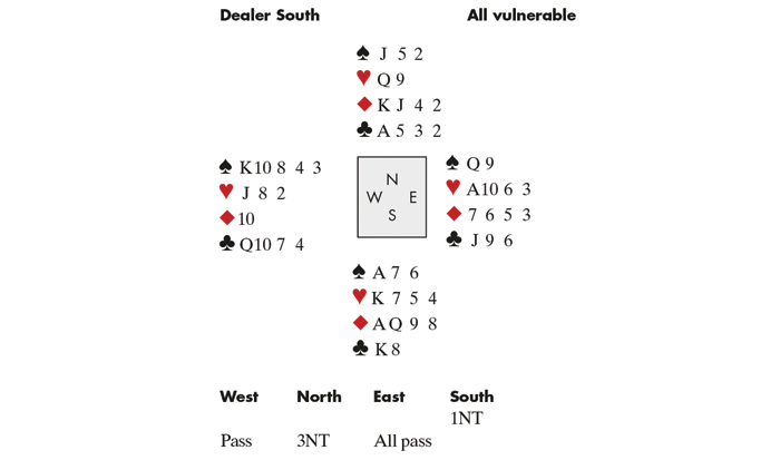 Phil worked out that the only chance of creating the elusive extra trick came from the Heart suit: if West held J 8 x or 10 8 x a second trick could be established. At trick four, he played a Heart to the nine! East won the ten and returned a Club. Phil won in dummy and advanced the ♥Q, taken by East with the ace, while the eight made a welcome appearance from West. When the king of Hearts brought down the Jack, the ♥7 was declarer’s ninth trick.