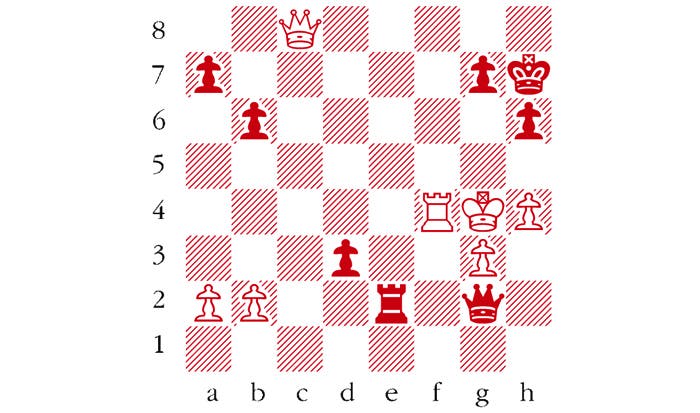 Black to play. This is from Caruana-Jakovenko, Khanty-Mansiysk 2015. Black is winning -easily, but can you find the most accurate continuation, which forces mate in six moves at the most? Answers to me at The Spectator by Tuesday 9 June or via email to victoria@spectator.co.uk or by fax on 020 7681 3773. The winner will be the first correct answer out of a hat, and each week there is a prize of £20. Please include a postal address and allow six weeks for prize delivery.