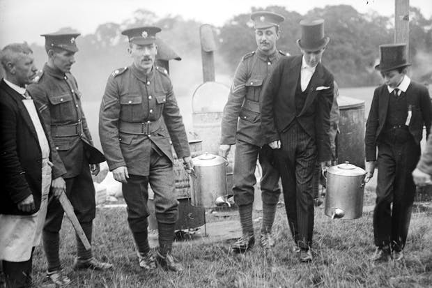 Young Etonians help soldiers carry tea urns at a 'Soldiers' Tea Party' in Windsor Great Park