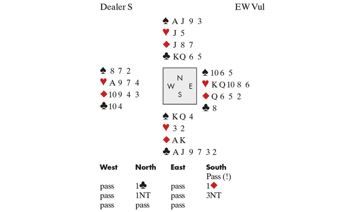 I deny passing! Or rather, let me explain. A few minutes previously, Helgemo and his partner had joined our table, and he and I had been joking about how cold it was in the Arctic Circle. Then I picked up the South hand. I opened 1♣. But when the bidding tray came back from the other side of the table, I looked down and saw my partner had responded… 1♣. Somehow I had placed the green pass card on the tray. I turned to Helgemo. ‘I’ve got a serious bidding problem,’ I said, ‘and even you won’t be able to guess what it is.’ I decided to bid 1 — which I felt was least likely to be passed out. David responded 1NT, showing 12-14 points. I bid 3NT. ‘Wow,’ said Helgemo, when I put dummy down. ‘That’s the best dummy from a passed hand I’ve ever seen.’ 3NT was off on a heart lead (5♣ or 5♠ makes). But you can’t say I didn’t make an impression.