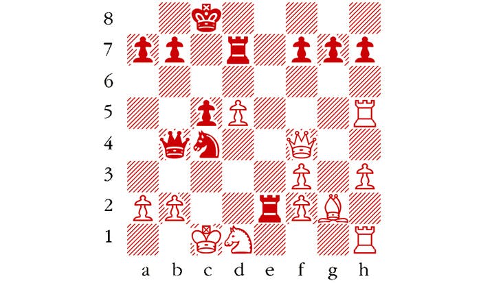 Black to play. This position is from Kosmo-Smerdon, Goa 2002. Can you spot Black’s beautiful winning move? Answers to me at The Spectator by Tuesday 25 August or via email to victoria@spectator.co.uk or by fax on 020 7681 3773. The winner will be the first correct answer out of a hat, and each week there is a prize of £20. Please include a postal address and allow six weeks for prize delivery.