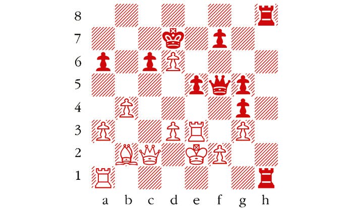 Black to play. This position is a variation from variation from Maslak-Smerdon, Pardubice 2007. Black has powered through on the kingside. How can he finish off? Answers to me at The Spectator by Tuesday 1 September or via email to victoria@spectator.co.uk or by fax on 020 7681 3773. The winner will be the first correct answer out of a hat, and each week there is a prize of £20. Please include a postal address and allow six weeks for prize delivery.