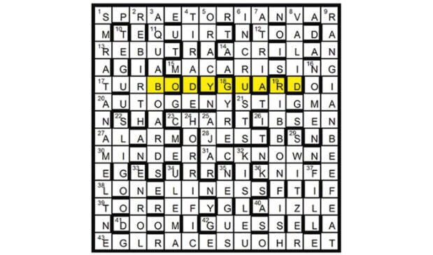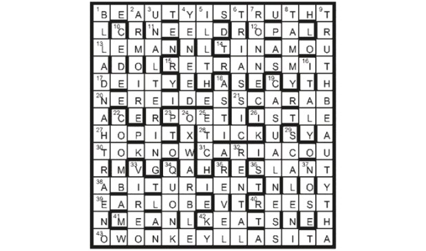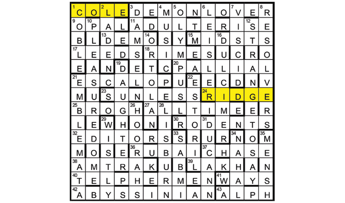 The Poem was ‘Kubla Khan’ by Samuel Taylor Coleridge. 3A, 23, 42, 43, 3D, 4, 10 and 16 are words from the poem. KUBLA KHAN appears in the twelfth row. COLE (1A) and RIDGE (24) were to be shaded.