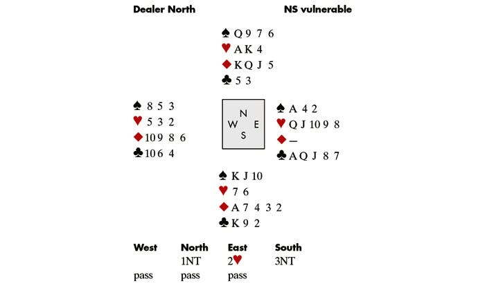 East’s 2♥ bid showed hearts and a minor. He led the ♣Q. Paul ducked. East continued with the ♣Q, which Paul won with the ♣K. He now ran five rounds of diamonds. East discarded two spades and two hearts. On the fifth diamond, West — an eminent player who shall remain nameless — casually decided to give his partner ‘count’ in hearts by playing the ♥2. Disaster! It was hard to envisage, but that ª2 turned out to be crucial in guarding the ♥5 — which was bigger than declarer’s third heart. East was now squeezed: if he threw a third heart, Paul could cash three hearts (♥AK4) for nine tricks; so he discarded a winning club, and now Paul could knock out the ♠A with impunity.
