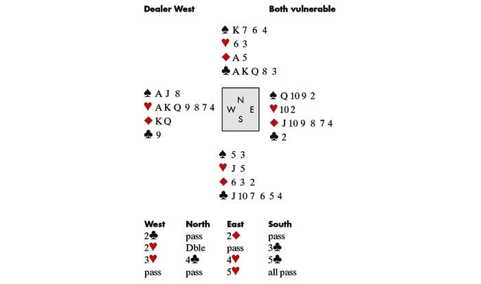 West opened a strong 2♣. In the other room, Andrew Robson and Tony Forrester had an uncontested auction: 2♣ – 2♦ – 3♥ – 4♥. Not at this table. First, Bakhshi found a double. Then he found a raise to 4♣. And then Gold — undeterred by the vulnerability — stuck his neck out and bid 5♣. Poor East (Thomas Bessis) thought for ages before bidding 5♥. Bakhshi led the A♣ and switched to a trump; Gold carefully played the ♥5 rather than his ♥J so that declarer would have no entry to dummy. One down. At the time of writing, England are in the semi-finals. If they carry on bidding like this, who knows… We may be out of one world cup, but could we be on the verge of bringing home another?