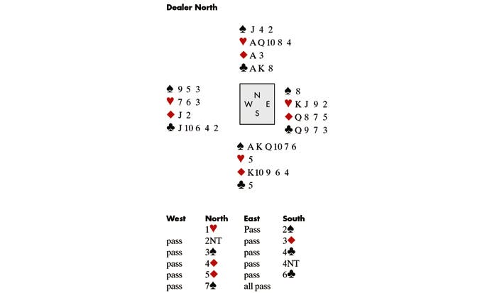 Against Bakhshi, West led a club, which meant he had to go for a 3–3 diamond break, a heart finesse, or a squeeze against East. He won the club, played a trump to the ♠10 and cashed the Q♠. Then he played ♦AK, and ruffed a diamond with the ♠J. Next came the ♣K, a club ruff, and three more trumps. He was down to ♥5♦10 opposite ♥AQ. East was down to ♥Q♦Q. Unerringly, Bakhshi played a heart to the ♥A, dropping East’s ♥K.
